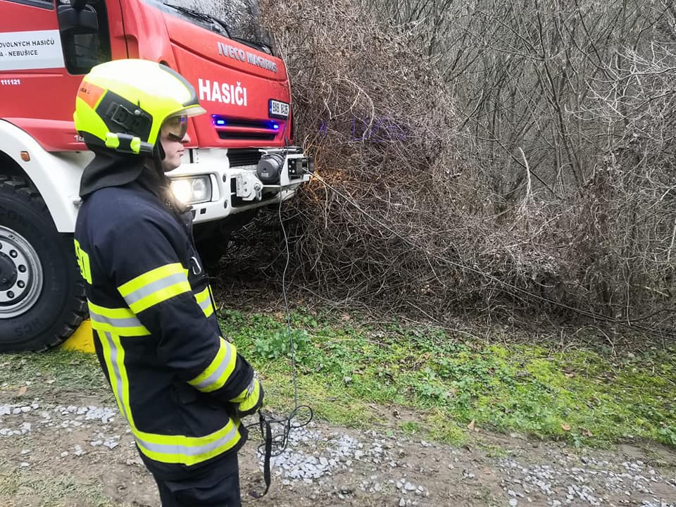 9.12. byla naše jednotka vyslána do ulice K Vinicím v Nebušicích. Jednalo se o vyproštění dodávky, která uvízla nakloněná ve svahu. Na místě jsme provedli zajištění vozu proti převrácení a jeho vyproštění za pomoci lanového navijáku naší cisterny.
